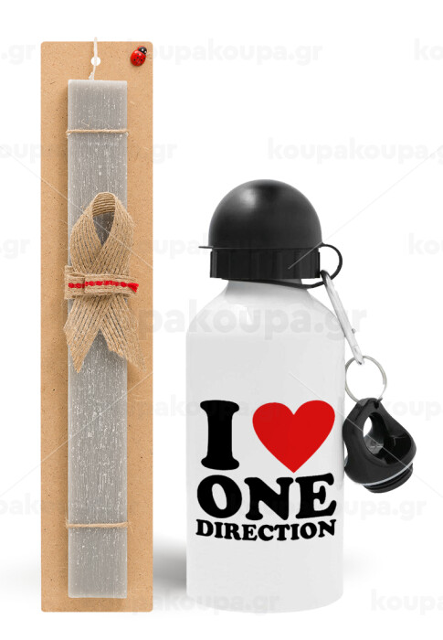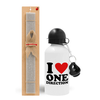I Love, One Direction, Πασχαλινή Λαμπάδα με παγούρι μεταλλικό αλουμινίου (500ml) & κερί αρωματικό πλακέ (30cm) (ΓΚΡΙ)