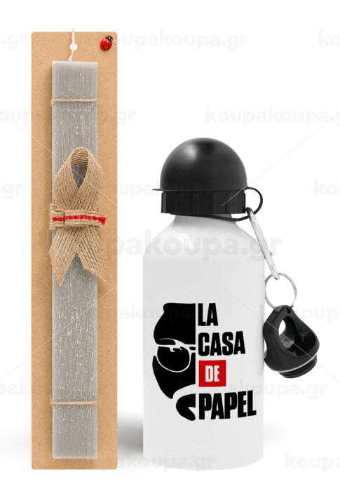 La casa de papel, Πασχαλινή Λαμπάδα με παγούρι μεταλλικό αλουμινίου (500ml) & κερί αρωματικό πλακέ (30cm) (ΓΚΡΙ)