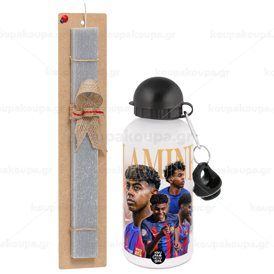 lamine yamal FCB, Πασχαλινή Λαμπάδα με παγούρι μεταλλικό αλουμινίου (500ml) & κερί αρωματικό πλακέ (30cm) (ΓΚΡΙ)
