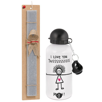 I Love you thissss much..., Πασχαλινή Λαμπάδα με παγούρι μεταλλικό αλουμινίου (500ml) & κερί αρωματικό πλακέ (30cm) (ΓΚΡΙ)