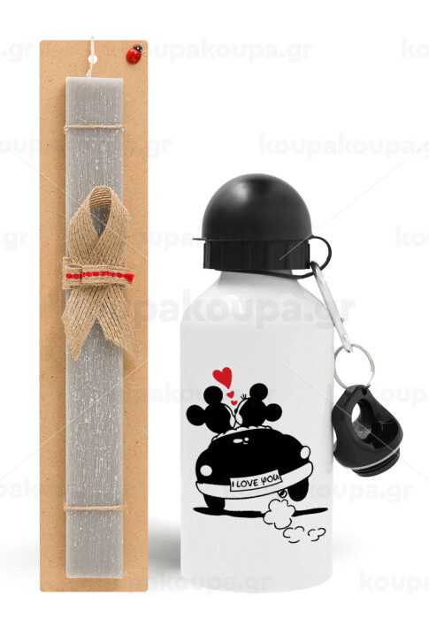 Love Car, Πασχαλινή Λαμπάδα με παγούρι μεταλλικό αλουμινίου (500ml) & κερί αρωματικό πλακέ (30cm) (ΓΚΡΙ)