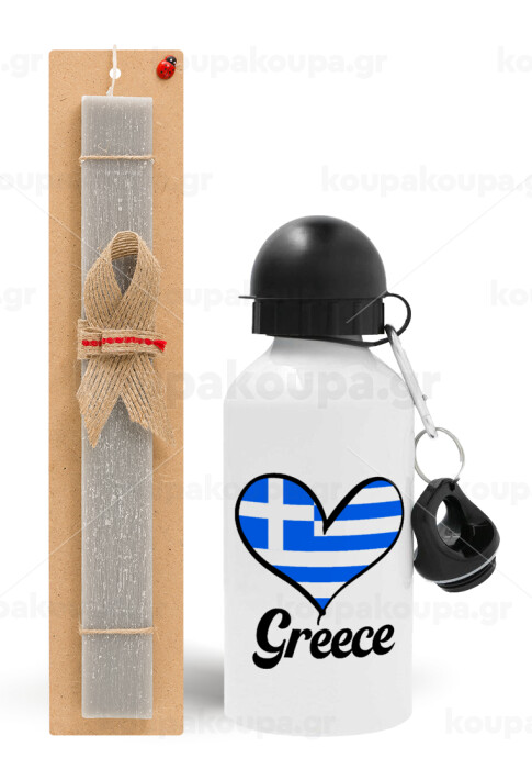 Greece flag, Πασχαλινή Λαμπάδα με παγούρι μεταλλικό αλουμινίου (500ml) & κερί αρωματικό πλακέ (30cm) (ΓΚΡΙ)