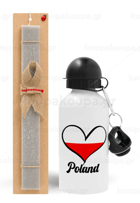 Poland flag, Πασχαλινή Λαμπάδα με παγούρι μεταλλικό αλουμινίου (500ml) & κερί αρωματικό πλακέ (30cm) (ΓΚΡΙ)