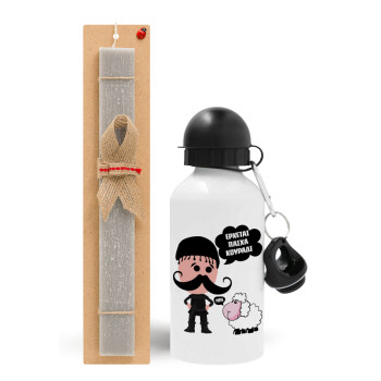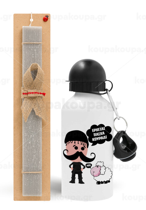 Κρητικός "Έρχεται Πάσχα κουράδι", Πασχαλινή Λαμπάδα με παγούρι μεταλλικό αλουμινίου (500ml) & κερί αρωματικό πλακέ (30cm) (ΓΚΡΙ)