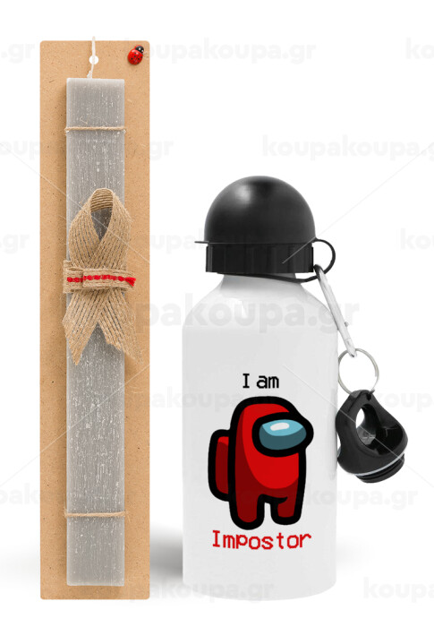 Among US i am impostor, Πασχαλινή Λαμπάδα με παγούρι μεταλλικό αλουμινίου (500ml) & κερί αρωματικό πλακέ (30cm) (ΓΚΡΙ)