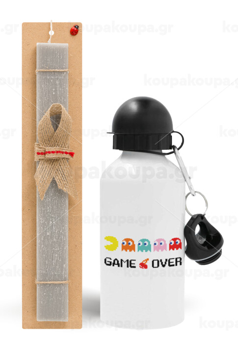 GAME OVER pac-man, Πασχαλινή Λαμπάδα με παγούρι μεταλλικό αλουμινίου (500ml) & κερί αρωματικό πλακέ (30cm) (ΓΚΡΙ)