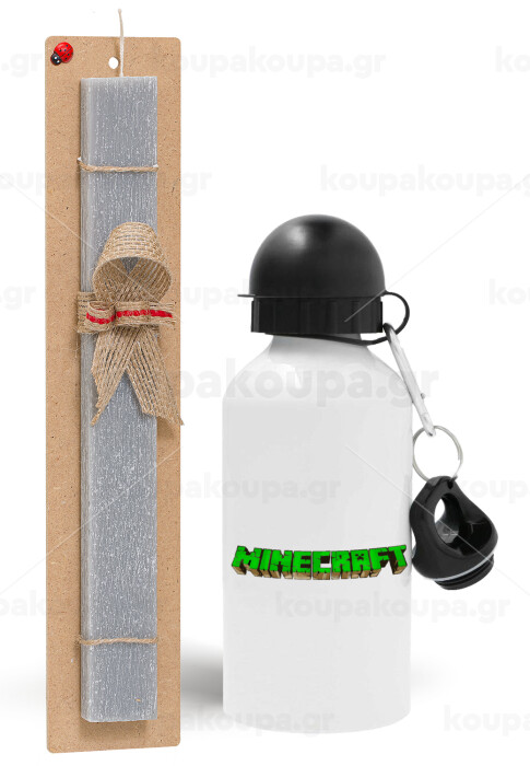 Minecraft logo green, Πασχαλινή Λαμπάδα με παγούρι μεταλλικό αλουμινίου (500ml) & κερί αρωματικό πλακέ (30cm) (ΓΚΡΙ)