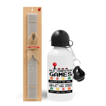 OLD computer games couldn't be won just like real life!, Πασχαλινή Λαμπάδα με παγούρι μεταλλικό αλουμινίου (500ml) & κερί αρωματικό πλακέ (30cm) (ΓΚΡΙ)