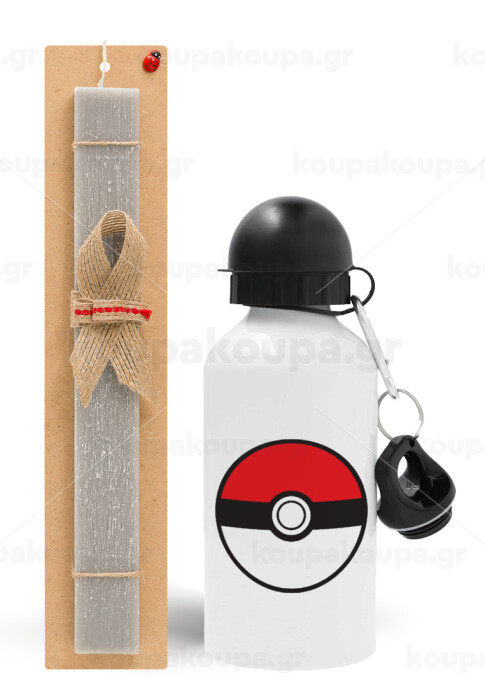 Pokemon ball, Πασχαλινή Λαμπάδα με παγούρι μεταλλικό αλουμινίου (500ml) & κερί αρωματικό πλακέ (30cm) (ΓΚΡΙ)
