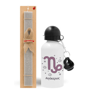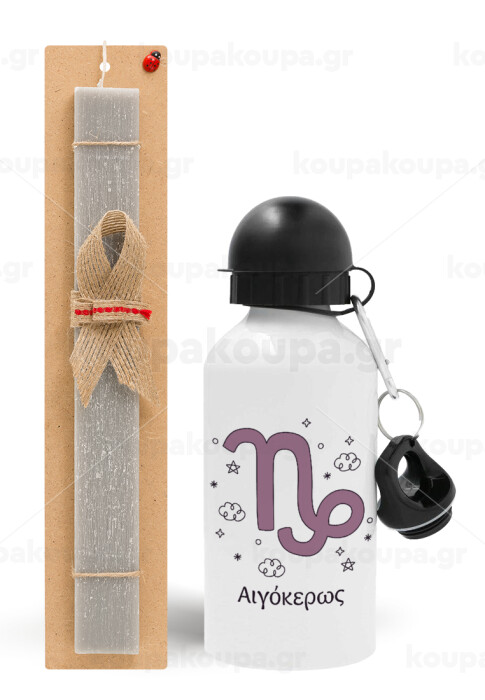 Ζώδια Αιγόκερως, Πασχαλινή Λαμπάδα με παγούρι μεταλλικό αλουμινίου (500ml) & κερί αρωματικό πλακέ (30cm) (ΓΚΡΙ)