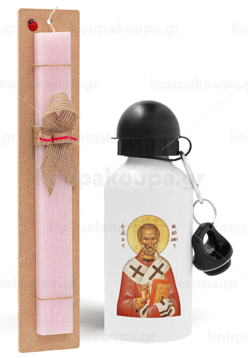 Άγιος Νικόλαος, Πασχαλινή Λαμπάδα με παγούρι μεταλλικό αλουμινίου (500ml) & κερί αρωματικό πλακέ (30cm) (ΡΟΖ)