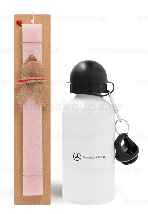Mercedes small logo, Πασχαλινή Λαμπάδα με παγούρι μεταλλικό αλουμινίου (500ml) & κερί αρωματικό πλακέ (30cm) (ΡΟΖ)