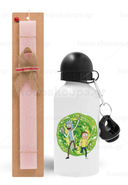 Rick and Morty, Πασχαλινή Λαμπάδα με παγούρι μεταλλικό αλουμινίου (500ml) & κερί αρωματικό πλακέ (30cm) (ΡΟΖ)