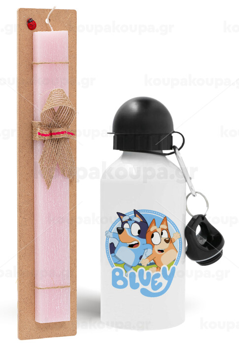 Μπλε, Πασχαλινή Λαμπάδα με παγούρι μεταλλικό αλουμινίου (500ml) & κερί αρωματικό πλακέ (30cm) (ΡΟΖ)