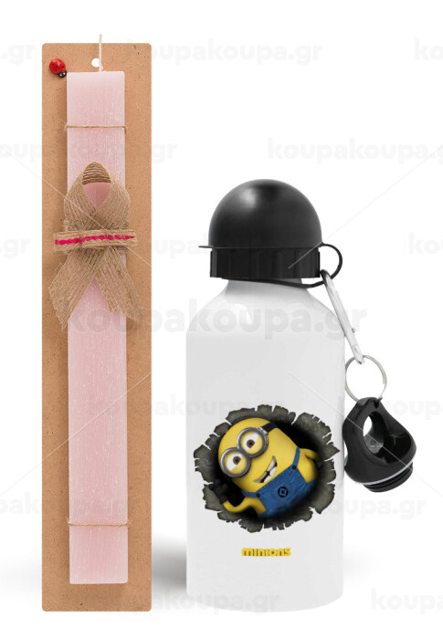 Minions hi, Πασχαλινή Λαμπάδα με παγούρι μεταλλικό αλουμινίου (500ml) & κερί αρωματικό πλακέ (30cm) (ΡΟΖ)