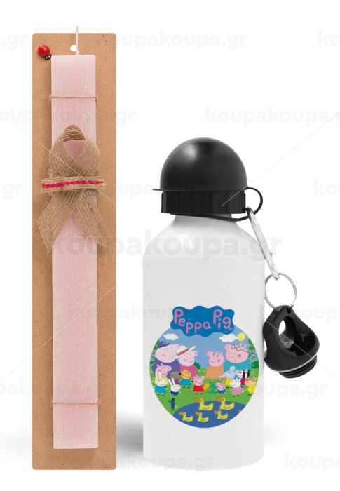 Peppa pig Family, Πασχαλινή Λαμπάδα με παγούρι μεταλλικό αλουμινίου (500ml) & κερί αρωματικό πλακέ (30cm) (ΡΟΖ)