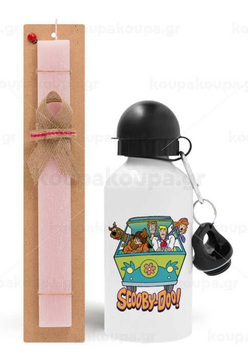 Scooby Doo car, Πασχαλινή Λαμπάδα με παγούρι μεταλλικό αλουμινίου (500ml) & κερί αρωματικό πλακέ (30cm) (ΡΟΖ)