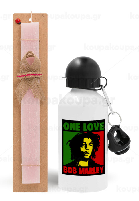 Bob marley, one love, Πασχαλινή Λαμπάδα με παγούρι μεταλλικό αλουμινίου (500ml) & κερί αρωματικό πλακέ (30cm) (ΡΟΖ)