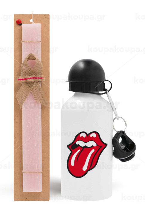 Rolling Stones Kiss, Πασχαλινή Λαμπάδα με παγούρι μεταλλικό αλουμινίου (500ml) & κερί αρωματικό πλακέ (30cm) (ΡΟΖ)
