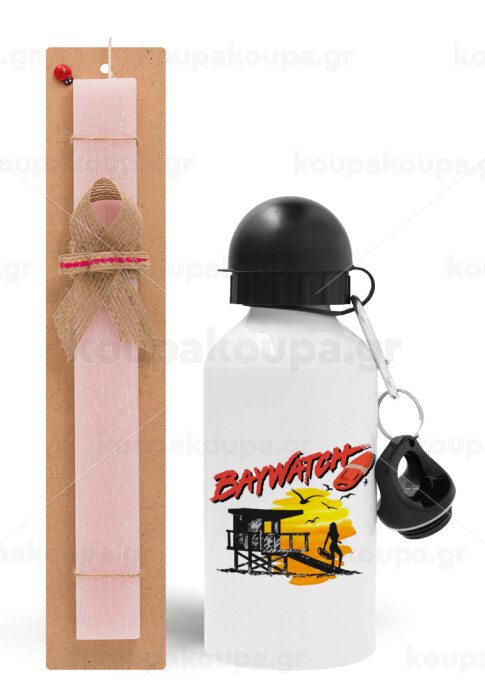 Baywatch, Πασχαλινή Λαμπάδα με παγούρι μεταλλικό αλουμινίου (500ml) & κερί αρωματικό πλακέ (30cm) (ΡΟΖ)