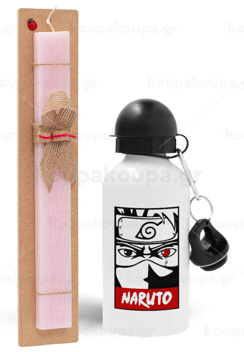 Naruto anime, Πασχαλινή Λαμπάδα με παγούρι μεταλλικό αλουμινίου (500ml) & κερί αρωματικό πλακέ (30cm) (ΡΟΖ)