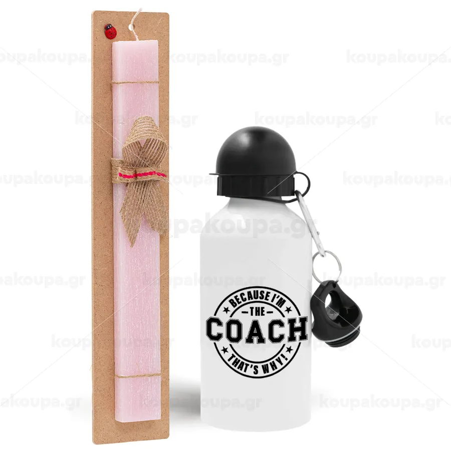 Because i'm the Coach, Πασχαλινή Λαμπάδα με παγούρι μεταλλικό αλουμινίου (500ml) & κερί αρωματικό πλακέ (30cm) (ΡΟΖ)