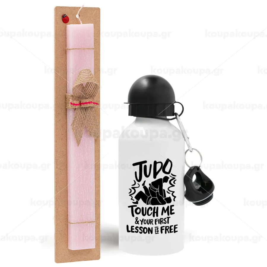 Judo Touch Me And Your First Lesson Is Free, Πασχαλινή Λαμπάδα με παγούρι μεταλλικό αλουμινίου (500ml) & κερί αρωματικό πλακέ (30cm) (ΡΟΖ)