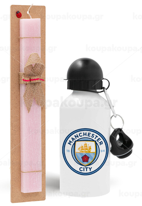 Manchester City FC , Πασχαλινή Λαμπάδα με παγούρι μεταλλικό αλουμινίου (500ml) & κερί αρωματικό πλακέ (30cm) (ΡΟΖ)