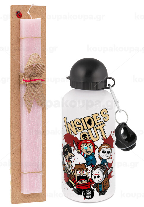Halloween Inside out, Πασχαλινή Λαμπάδα με παγούρι μεταλλικό αλουμινίου (500ml) & κερί αρωματικό πλακέ (30cm) (ΡΟΖ)