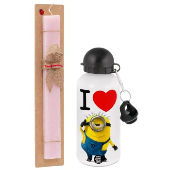I love by minion, Πασχαλινή Λαμπάδα με παγούρι μεταλλικό αλουμινίου (500ml) & κερί αρωματικό πλακέ (30cm) (ΡΟΖ)