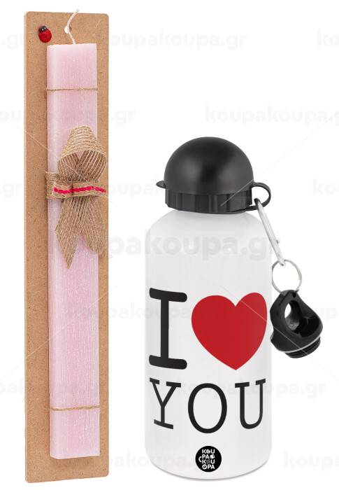 I Love you classic, Πασχαλινή Λαμπάδα με παγούρι μεταλλικό αλουμινίου (500ml) & κερί αρωματικό πλακέ (30cm) (ΡΟΖ)
