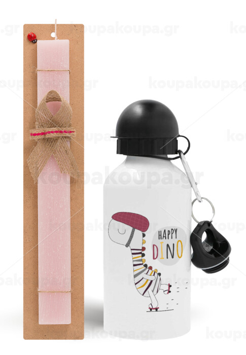 Happy Dino, Πασχαλινή Λαμπάδα με παγούρι μεταλλικό αλουμινίου (500ml) & κερί αρωματικό πλακέ (30cm) (ΡΟΖ)