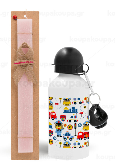 Rescue team cartoon, Πασχαλινή Λαμπάδα με παγούρι μεταλλικό αλουμινίου (500ml) & κερί αρωματικό πλακέ (30cm) (ΡΟΖ)