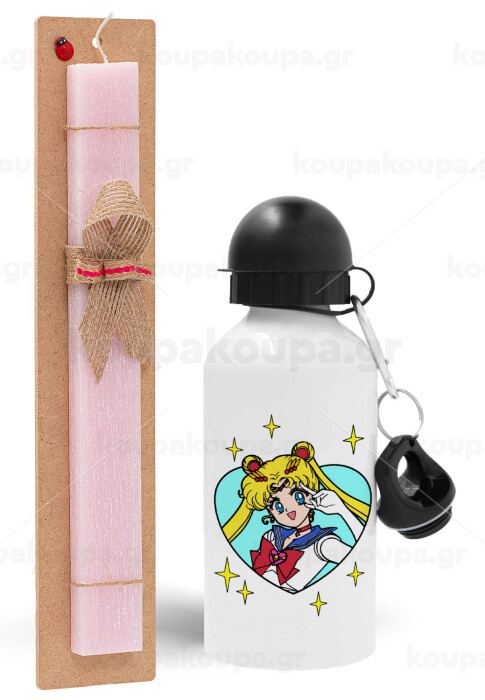 Sailor Moon star, Πασχαλινή Λαμπάδα με παγούρι μεταλλικό αλουμινίου (500ml) & κερί αρωματικό πλακέ (30cm) (ΡΟΖ)