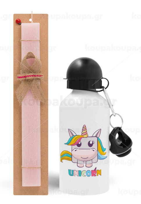 Unicorns cube, Πασχαλινή Λαμπάδα με παγούρι μεταλλικό αλουμινίου (500ml) & κερί αρωματικό πλακέ (30cm) (ΡΟΖ)
