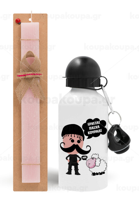 Κρητικός "Έρχεται Πάσχα κουράδι", Πασχαλινή Λαμπάδα με παγούρι μεταλλικό αλουμινίου (500ml) & κερί αρωματικό πλακέ (30cm) (ΡΟΖ)