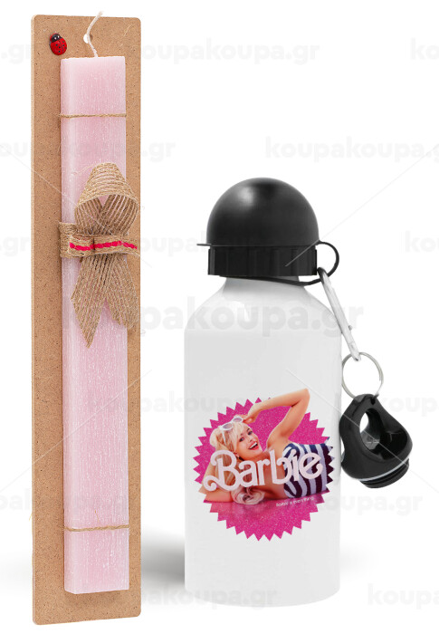 Barbie is everything, Πασχαλινή Λαμπάδα με παγούρι μεταλλικό αλουμινίου (500ml) & κερί αρωματικό πλακέ (30cm) (ΡΟΖ)