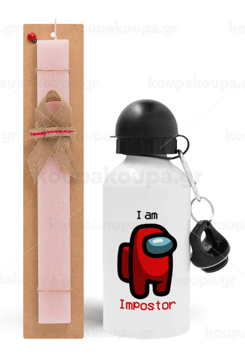 Among US i am impostor, Πασχαλινή Λαμπάδα με παγούρι μεταλλικό αλουμινίου (500ml) & κερί αρωματικό πλακέ (30cm) (ΡΟΖ)