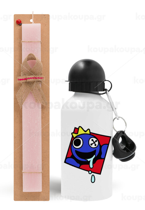 Blue, Rainbow friends, Πασχαλινή Λαμπάδα με παγούρι μεταλλικό αλουμινίου (500ml) & κερί αρωματικό πλακέ (30cm) (ΡΟΖ)