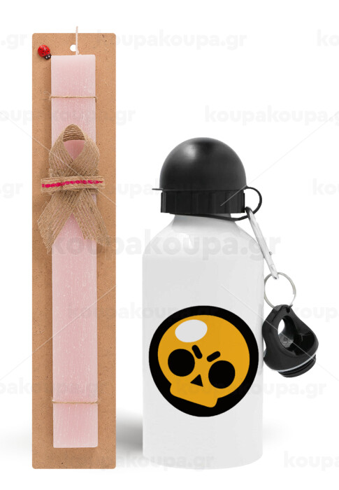 Brawl Stars Skull, Πασχαλινή Λαμπάδα με παγούρι μεταλλικό αλουμινίου (500ml) & κερί αρωματικό πλακέ (30cm) (ΡΟΖ)