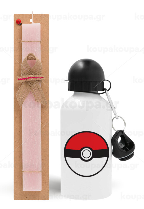 Pokemon ball, Πασχαλινή Λαμπάδα με παγούρι μεταλλικό αλουμινίου (500ml) & κερί αρωματικό πλακέ (30cm) (ΡΟΖ)