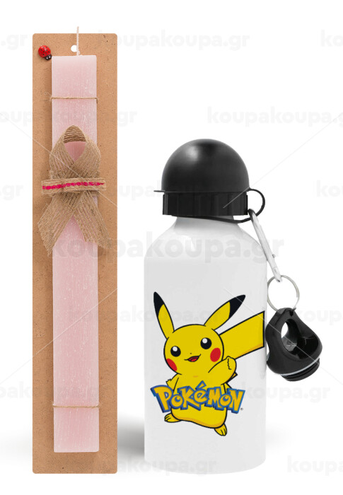 Pokemon pikachu, Πασχαλινή Λαμπάδα με παγούρι μεταλλικό αλουμινίου (500ml) & κερί αρωματικό πλακέ (30cm) (ΡΟΖ)