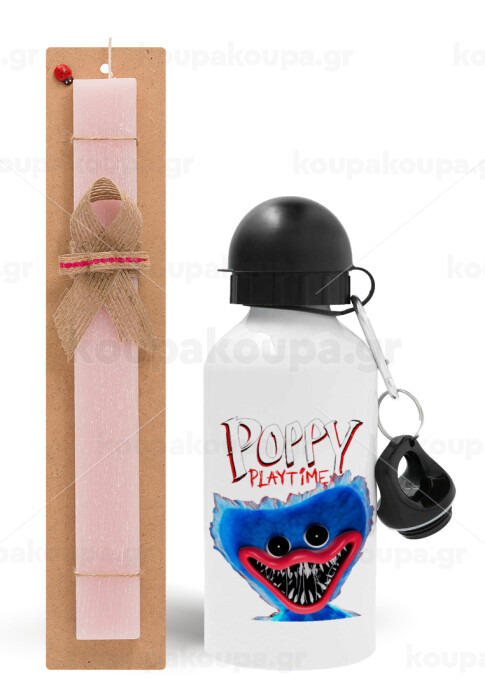 Poppy Playtime Huggy wuggy, Πασχαλινή Λαμπάδα με παγούρι μεταλλικό αλουμινίου (500ml) & κερί αρωματικό πλακέ (30cm) (ΡΟΖ)