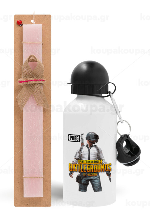 PUBG battleground royale, Πασχαλινή Λαμπάδα με παγούρι μεταλλικό αλουμινίου (500ml) & κερί αρωματικό πλακέ (30cm) (ΡΟΖ)