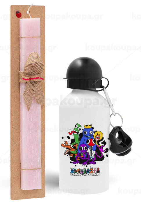 Rainbow friends, Πασχαλινή Λαμπάδα με παγούρι μεταλλικό αλουμινίου (500ml) & κερί αρωματικό πλακέ (30cm) (ΡΟΖ)