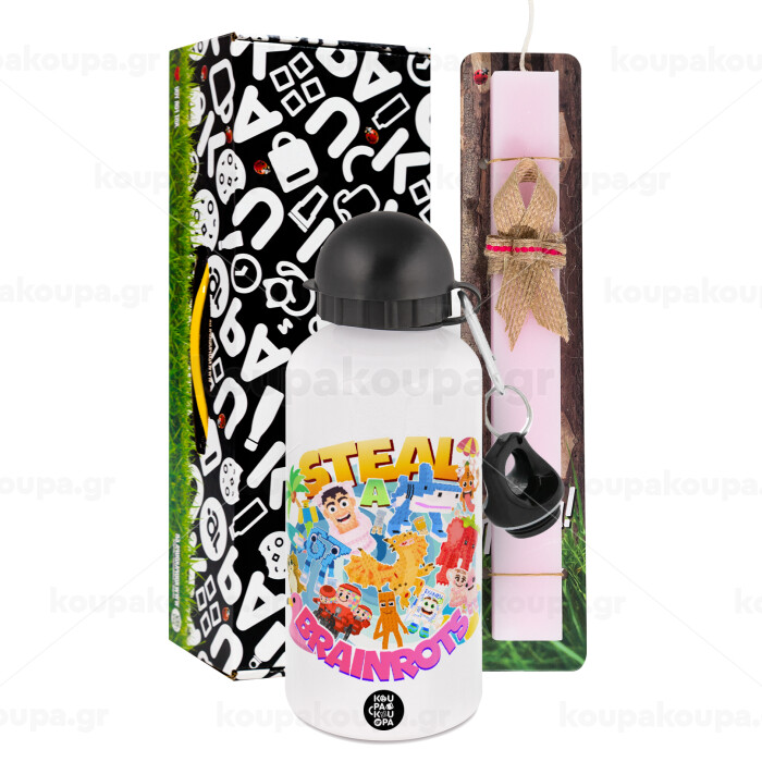 Roblox Steal a Brainrot, Πασχαλινή Λαμπάδα με παγούρι μεταλλικό αλουμινίου (500ml) & κερί αρωματικό πλακέ (30cm) (ΡΟΖ)