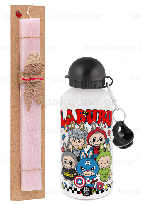 Labubu superheroes, Πασχαλινή Λαμπάδα με παγούρι μεταλλικό αλουμινίου (500ml) & κερί αρωματικό πλακέ (30cm) (ΡΟΖ)
