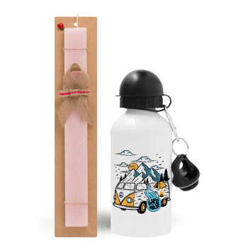 Life is a trip, Πασχαλινή Λαμπάδα με παγούρι μεταλλικό αλουμινίου (500ml) & κερί αρωματικό πλακέ (30cm) (ΡΟΖ)