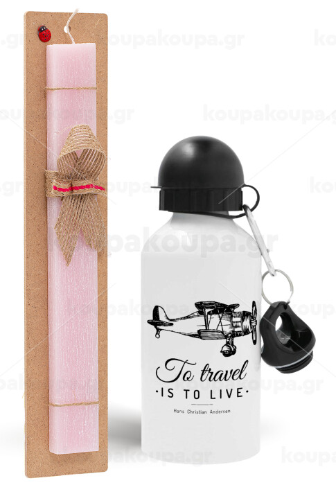To travel is to live, Πασχαλινή Λαμπάδα με παγούρι μεταλλικό αλουμινίου (500ml) & κερί αρωματικό πλακέ (30cm) (ΡΟΖ)