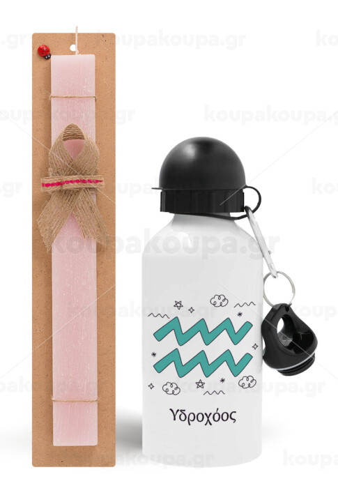Ζώδια Υδροχόος, Πασχαλινή Λαμπάδα με παγούρι μεταλλικό αλουμινίου (500ml) & κερί αρωματικό πλακέ (30cm) (ΡΟΖ)
